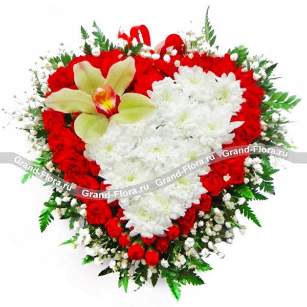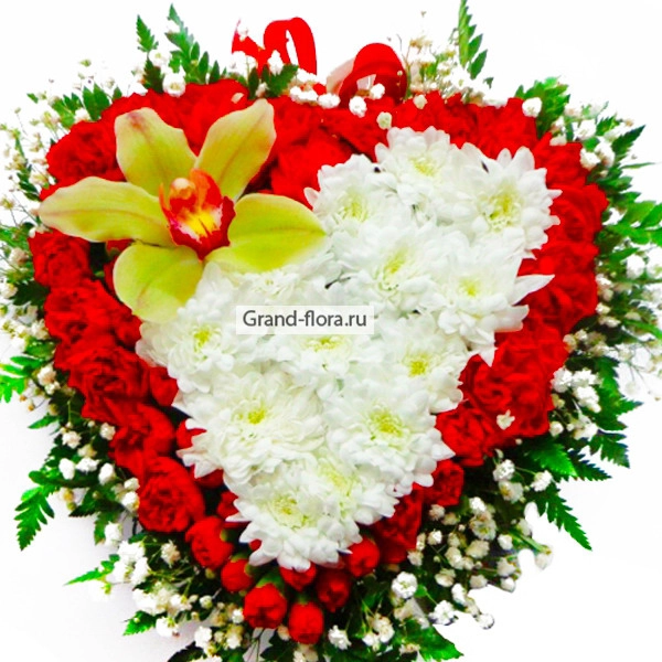 Сердце Аполлона - композиция в виде сердца из гвоздик, хризантем и орхидей