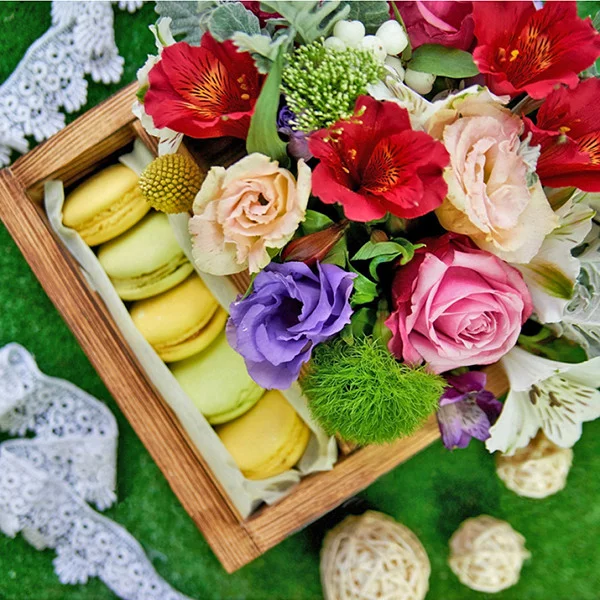 Стандартный: роза розовая - 3 шт., эустома фиолетовая - 1 шт., эустома белая - 1 шт., альстромерия красная - 1 шт., альстромерия белая - 1 шт., декоративная зелень, макаруны, оазис, деревянная коробка.
